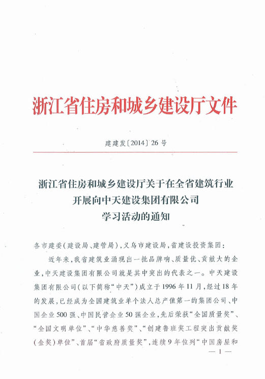 《浙江省住房和城乡建设厅关于在全省建筑行业开展向乐天使建设集团有限公司学习活动的通知》